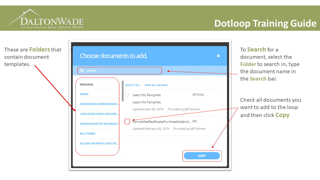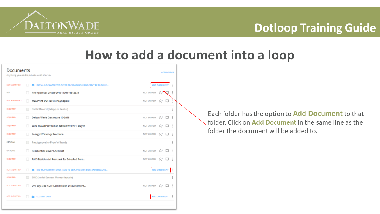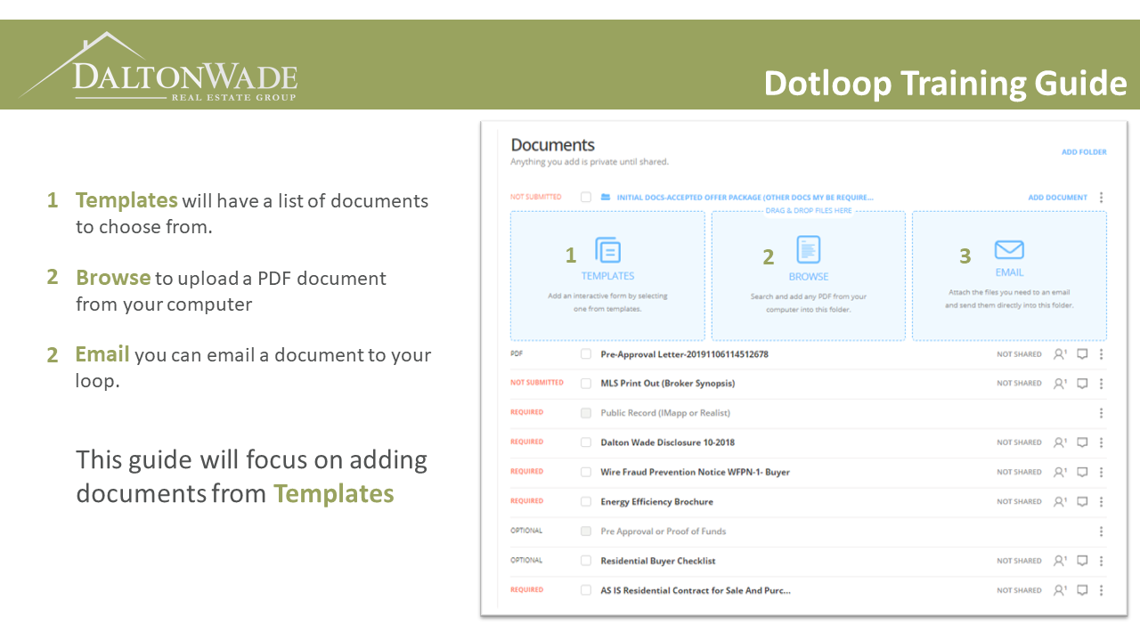 Dotloop offers several ways to add documents to your loop. Below are the instructions for each. 1. Click on “ADD DOCUMENT” to the right of the folder. Click “TEMPLATES” (see below). Scroll to category on the left side & select the document by placing ...
