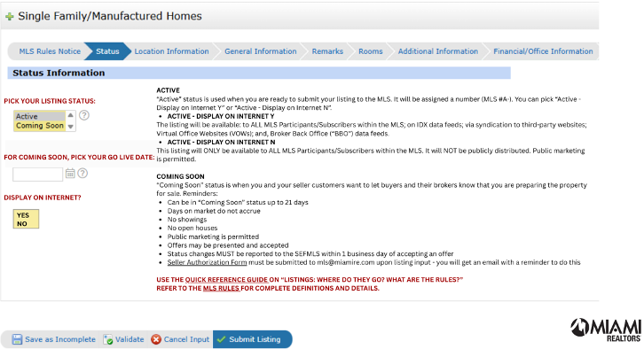 A revised “Seller Authorization Form” is required for all listings in “Coming Soon” status (send to comingsoon@miamire.com) and all “Office Exclusive” listings (send to mls@miamire.com).
