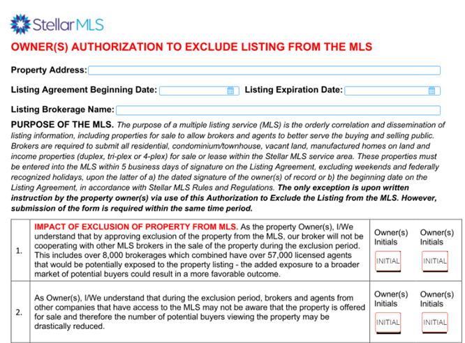 Owner(s) Authorization to Exclude Listing from the MLS